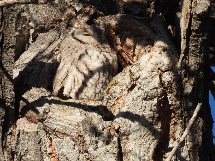 The next two photos show the excellent camouflage. Try to see the owl! It has used this nest for many years. These two photos were taken seconds apart as the owl was sunning itself in air about 5 degrees C. Its right eye is partly opened.