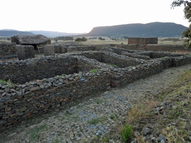 This is a Google Earth image of the Dungur Palace ruins a short distance west of Axum. Though sometimes called the palace of the Queen of Sheba, its construction of dressed volcanic stone without mortar suggests occupancy by royal elites during about 650 A.D., much too recent than roughly 965 B.C. for the Queen of Sheba. Across the road to the south is a field with moderately small uncut vertical stelae. They likely commemorate lesser officials. Modern subsistence farmers do their work among those stones. The following photos are pieces of a panorama looking east-to-south-to west from the north side of the ruins.