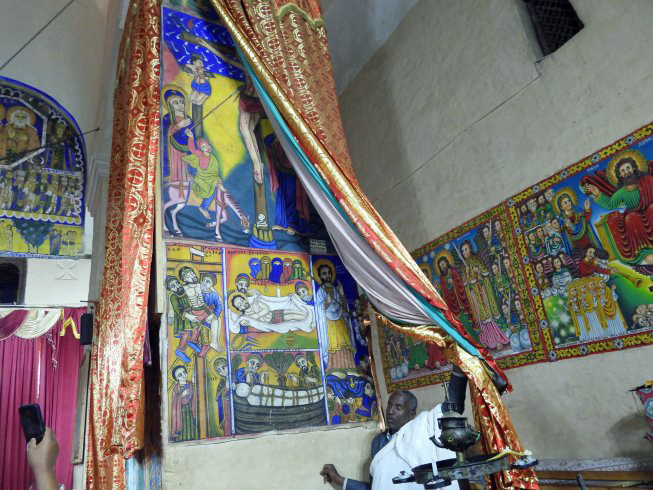 There is a rectangular chapel on the south side of this St. Mary of Zion site. It has an older illustrated Bible and interior decorations for instruction about Bible themes and stories.