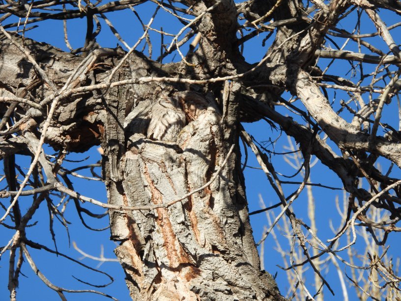 The next two photos show the excellent camouflage. Try to see the owl! It has used this nest for many years. These two photos were taken seconds apart as the owl was sunning itself in air about 5 degrees C. Its right eye is partly opened.