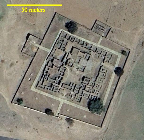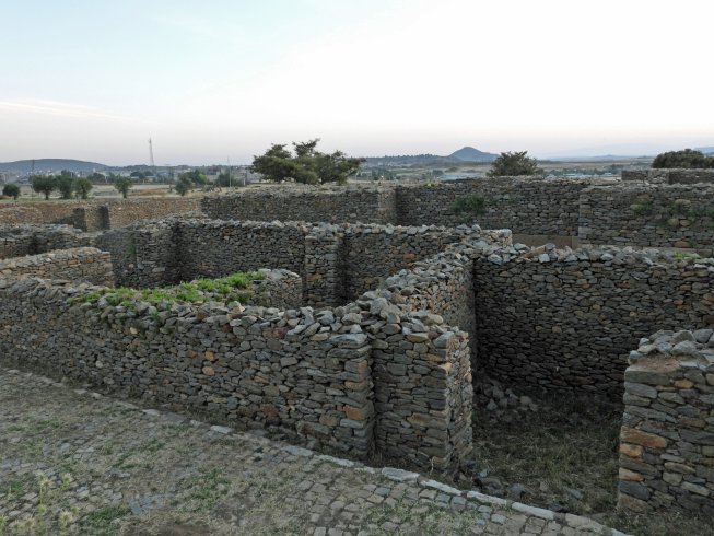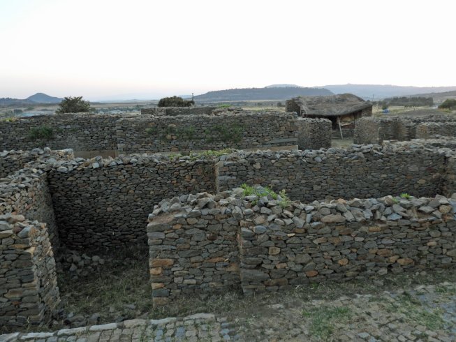 This is a Google Earth image of the Dungur Palace ruins a short distance west of Axum. Though sometimes called the palace of the Queen of Sheba, its construction of dressed volcanic stone without mortar suggests occupancy by royal elites during about 650 A.D., much too recent than roughly 965 B.C. for the Queen of Sheba. Across the road to the south is a field with moderately small uncut vertical stelae. They likely commemorate lesser officials. Modern subsistence farmers do their work among those stones. The following photos are pieces of a panorama looking east-to-south-to west from the north side of the ruins.