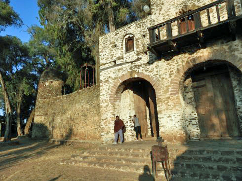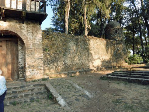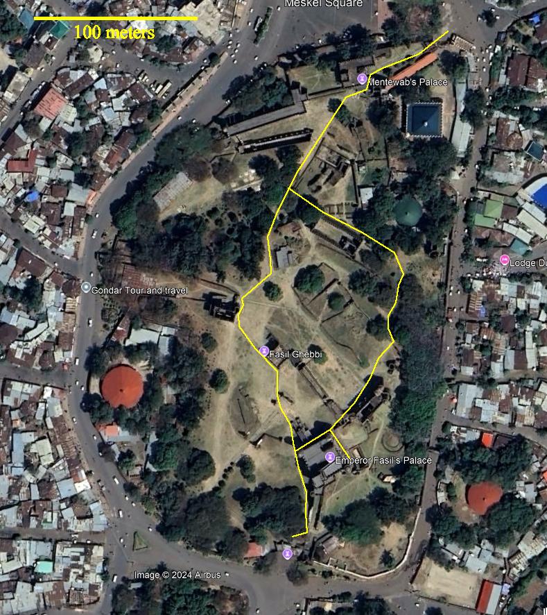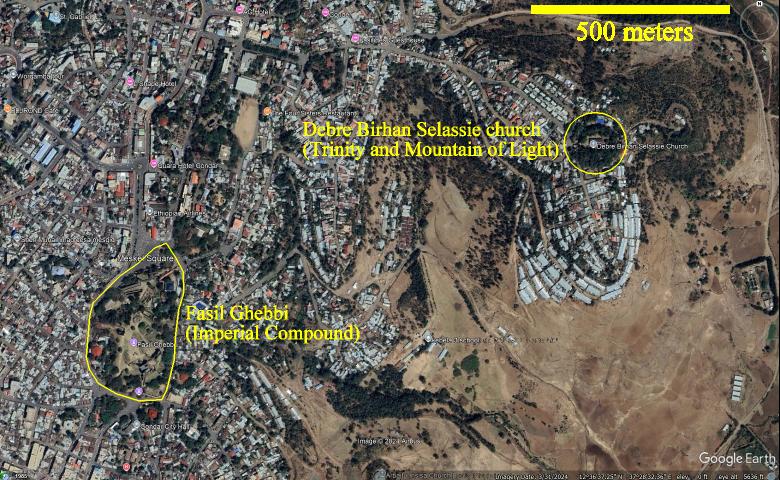 We visited two sites in Gondar: the imperial compound with its castles, and the Debre Birhan Selassie church. The locations are marked on this satellite view of part of Gondar.