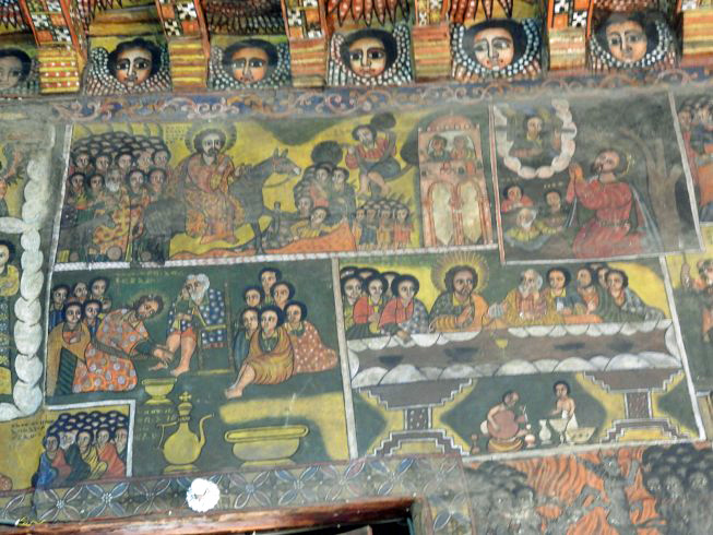 At the top left it appears to be the Palm Sunday ride of Jesus into Jerusalem. To its right is Jesus praying in Gethsemane. Below left is the washing of feet by Jesus. To the right is the last Supper illustration. In keeping with this art style, evil persons have their heads sideways showing only one eye, whereas good people have faces forward with two eyes showing. So Judas is in the middle of the right cluster of disciples.