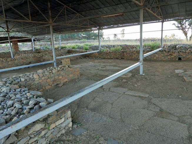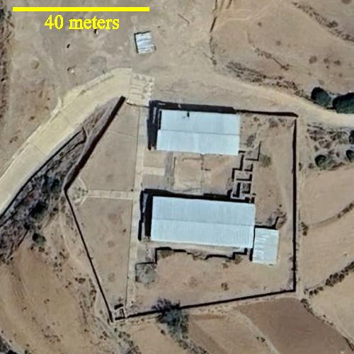 Google Earth satellite view of the archaeological site of the palace and tombs of King Kaleb and son, protected by shelter roofs.