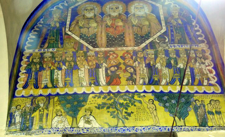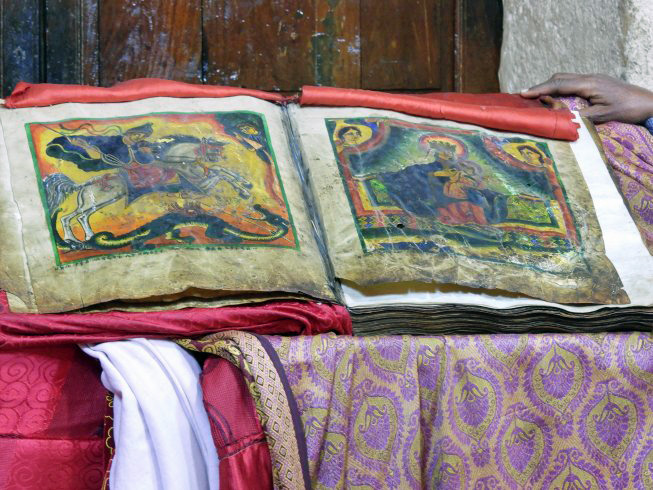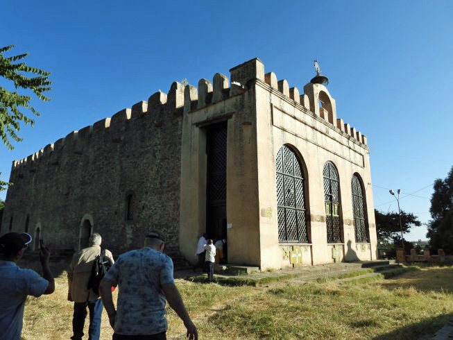 There is a rectangular chapel on the south side of this St. Mary of Zion site. It has an older illustrated Bible and interior decorations for instruction about Bible themes and stories.