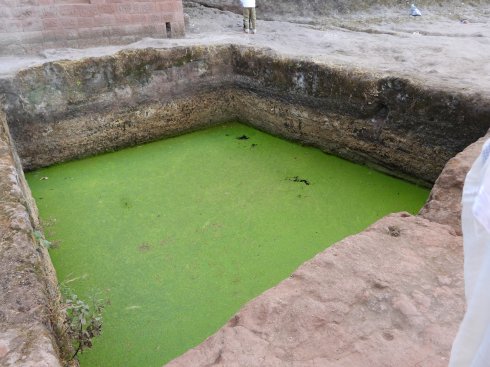 This is the courtyard between the Maryam (to left) and Meskel (rear) churches. A large pool is at the gathering of people in the center of the view.