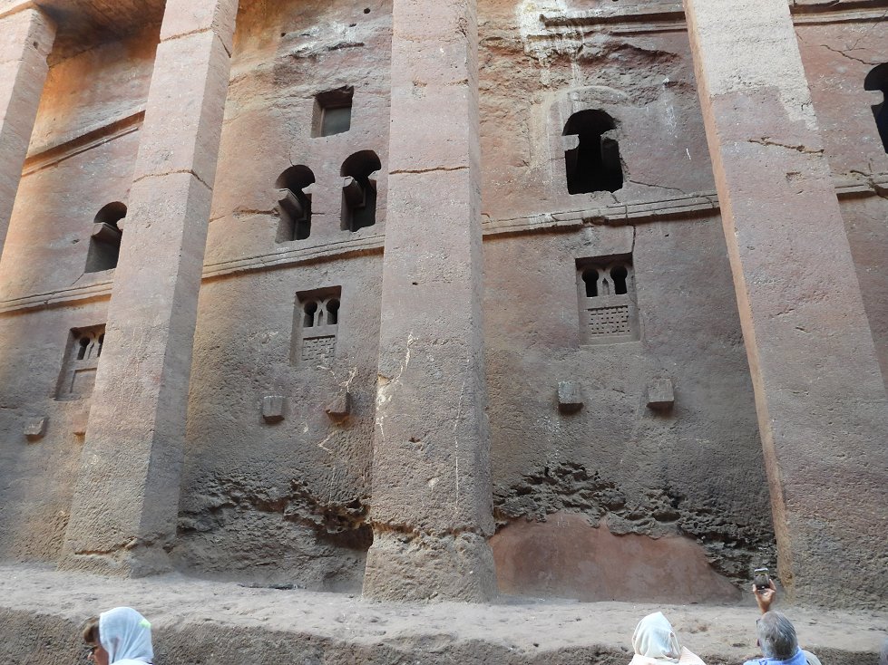 The rear of the large Medhane Alem church has intact columns, wall, and windows, but with cracks and crumblings from centuries of weathering.
