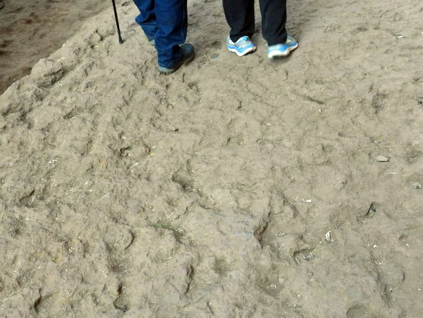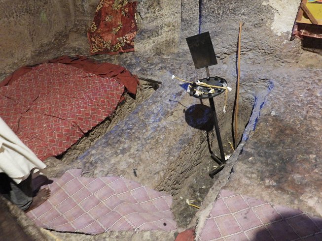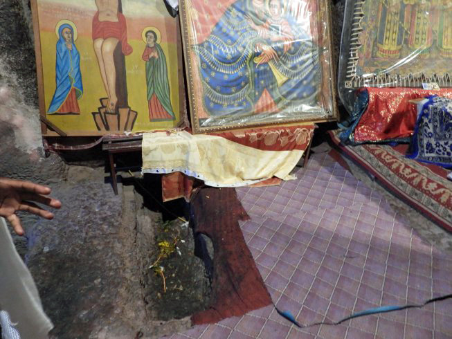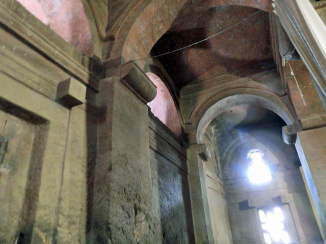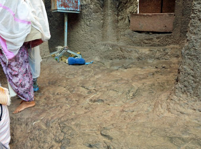 The volcanic rock from which the churches were carved is reddish and fine-grained. The surfaces on which we walked tended to be smooth from abundant wear to irregular and rough. Some paths were more gray from accumulated dust and dirt. In some places the walkways were on broken stones and pebbles. The next images illustrate the variety.