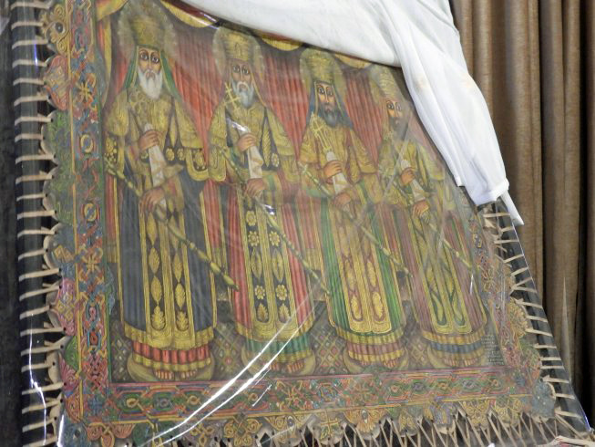 An old painting (on stretched canvas?) protected by plastic and cloth
