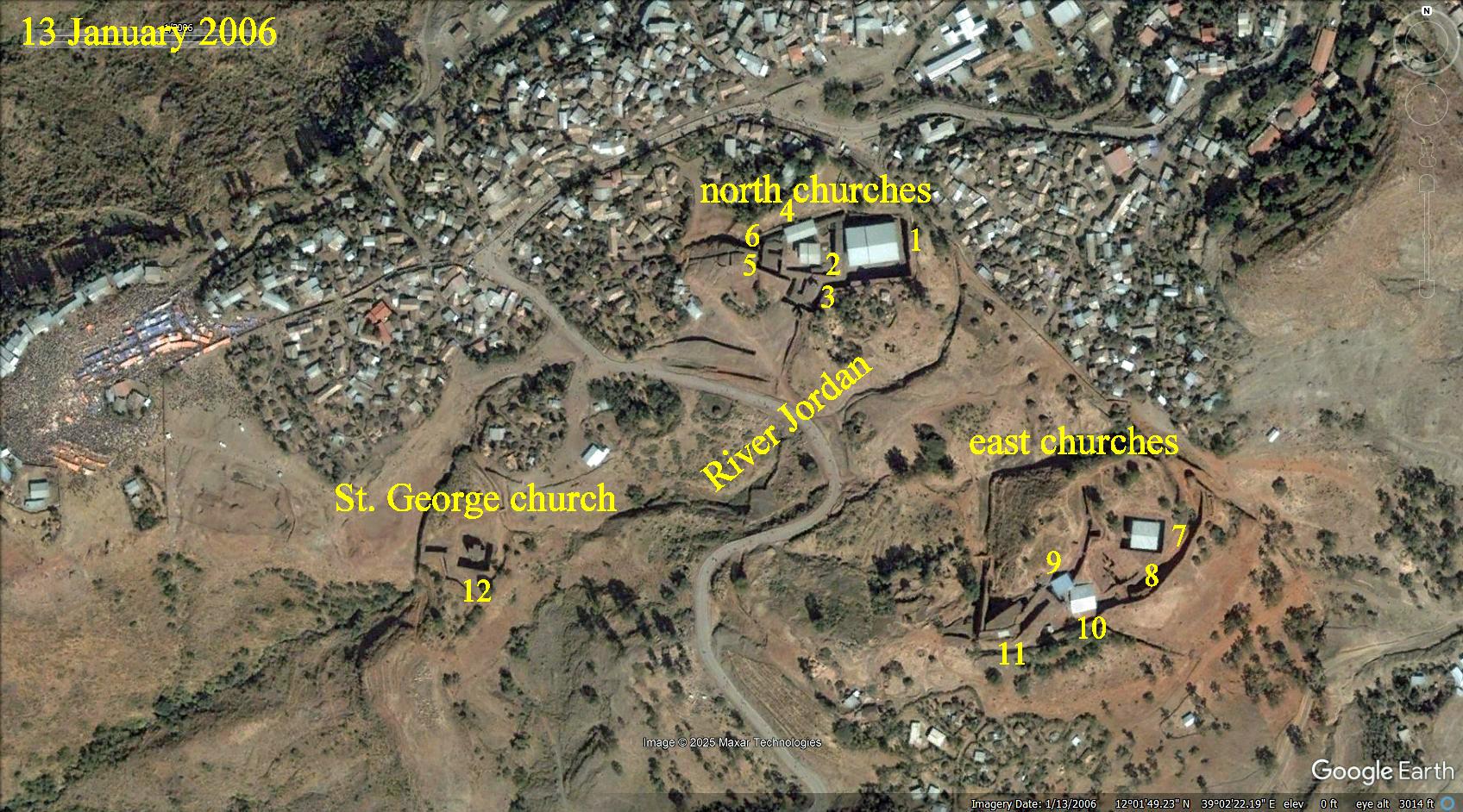 13 January 2006 shows some of the churches under metal roofs. Numbers are placed beside the churches according to these names (sometimes there is a variation in spelling of the names).