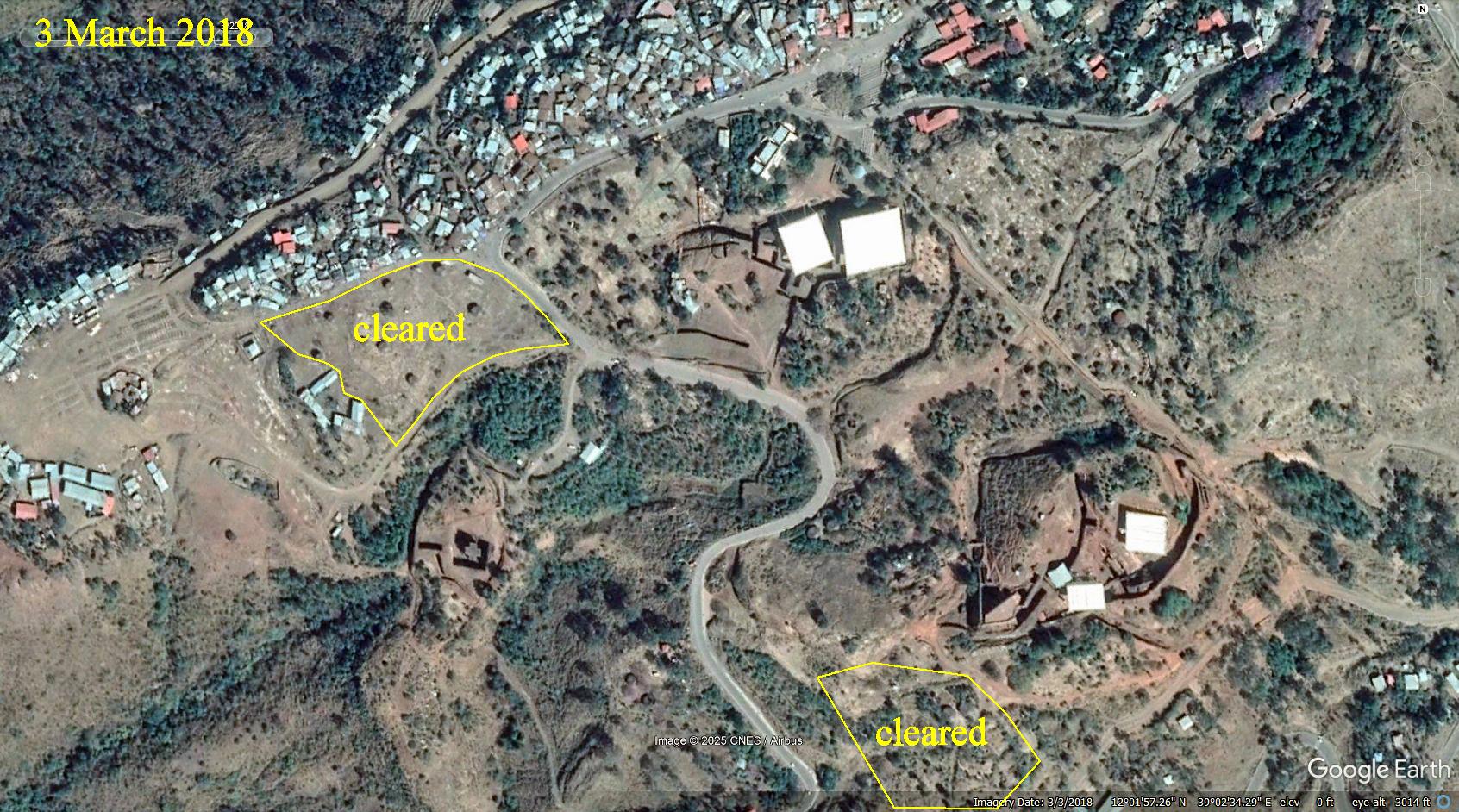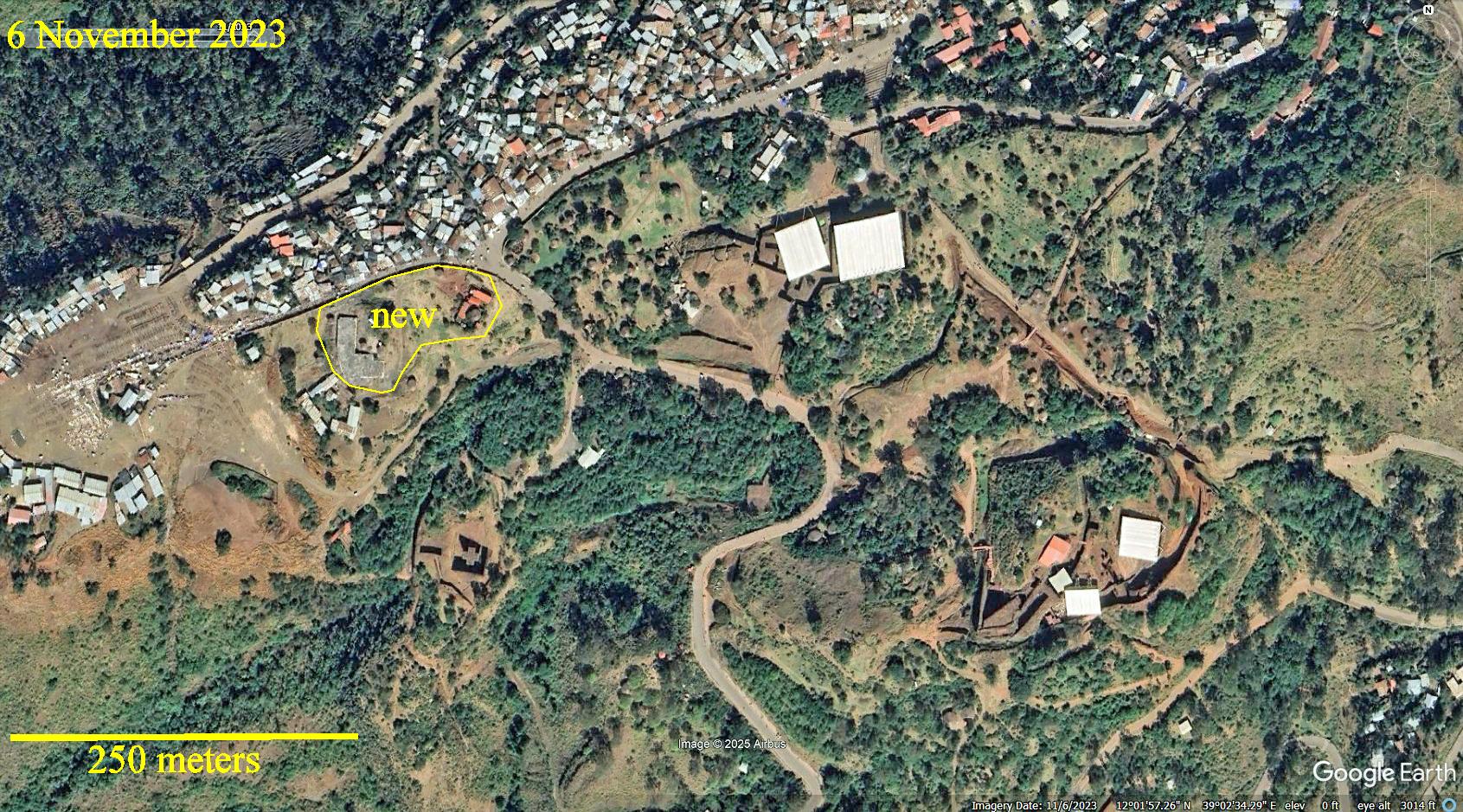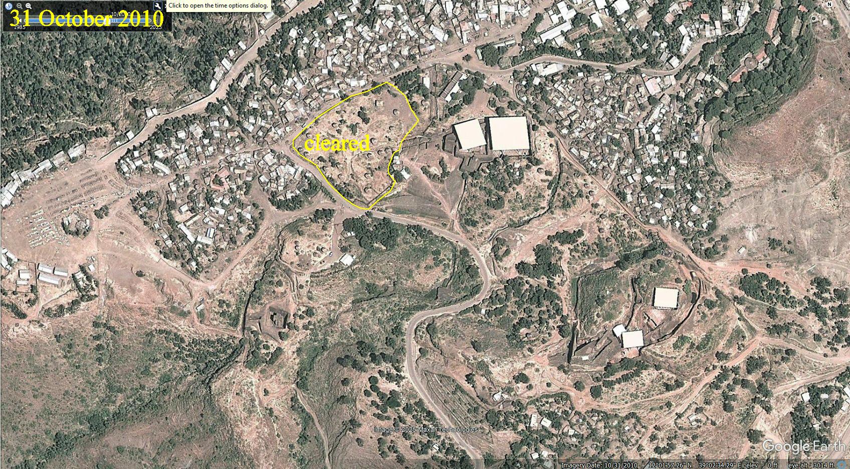 Google Earth provides satellite images of an area for multiple dates. I have selected these images for the rock churches area of Lalibela. Before 2006 the scenes lack detailed resolution. These dates were selected to show when something significant changed. The dates are marked in the upper left corners. The scale is in the lower left corner of the last (most recent) date. Within these scenes, areas of significant changes are outlined. Notice that I have posted large images here for good detail. You will need to slide your views to see all of the images.