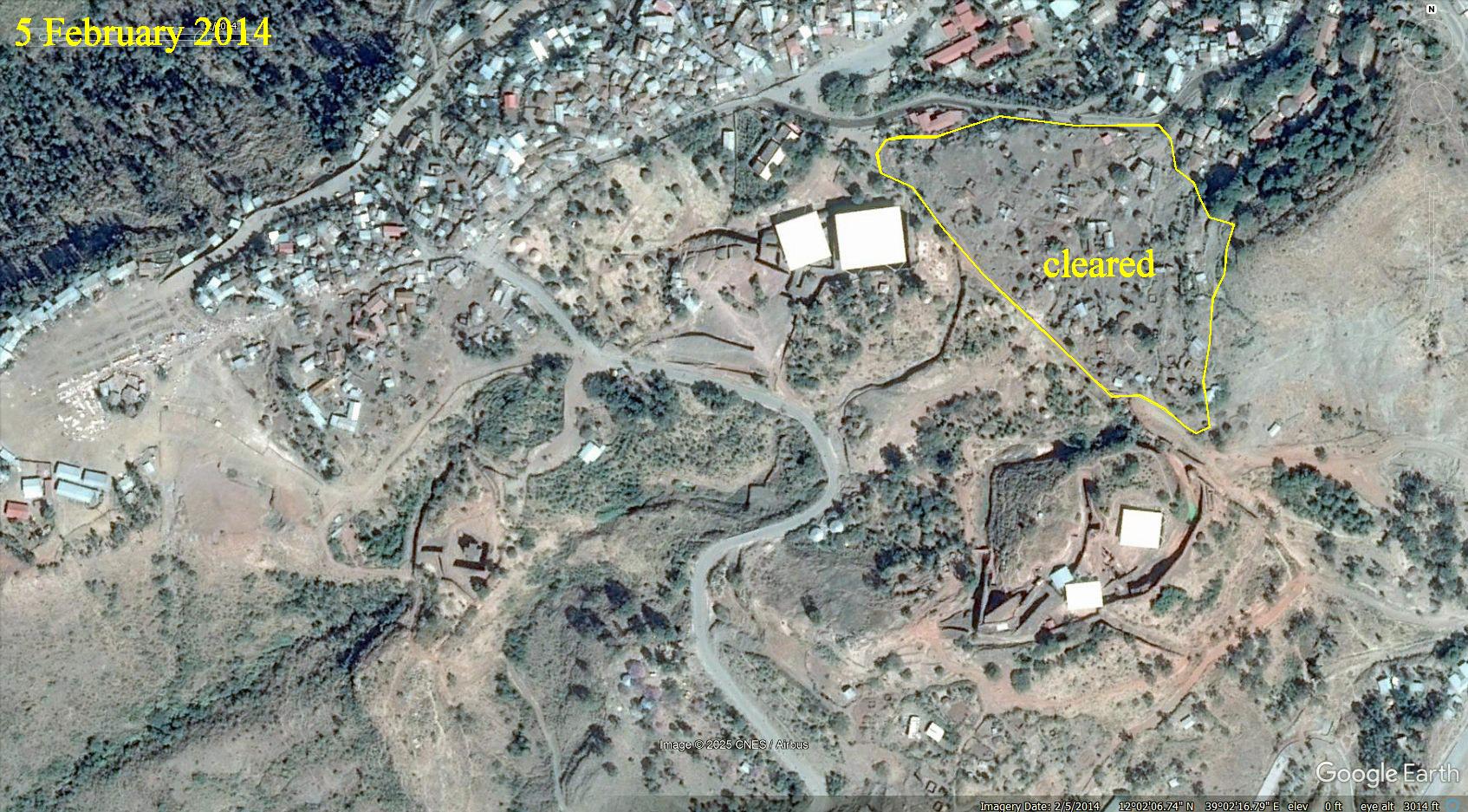 5 February 2014 shows the incomplete removal of modern buildings in a large area east of the northern churches, leaving only the old circular stone buildings.