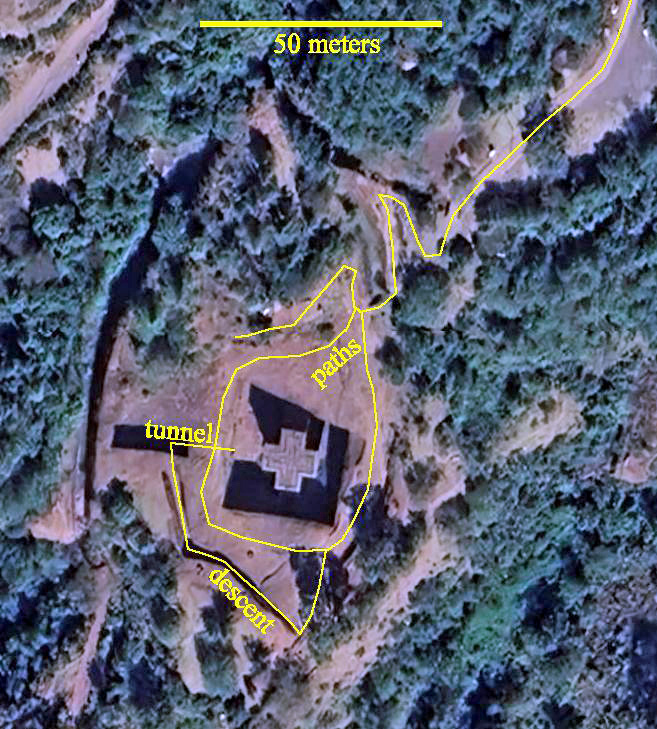 The yellow line shows the approximate paths at the St. George church, including the route for descending to its courtyard.
