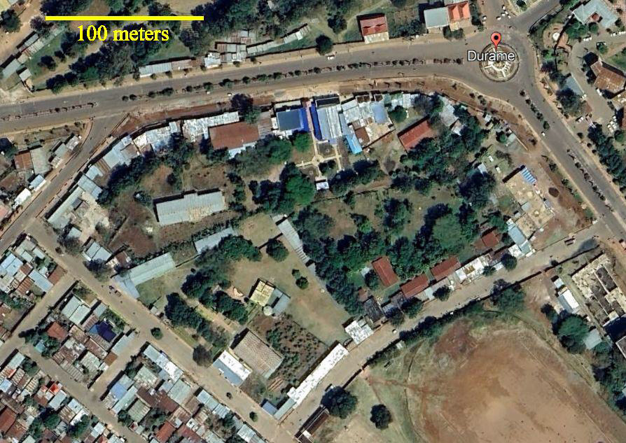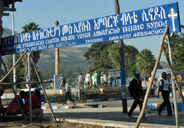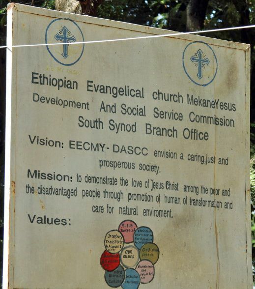 The campus of the Ambaricho Bilate Synod based in Durame is within this view next to the center of the city. Next is the view of the Synod' sign, with the pillar of the city center behind it.