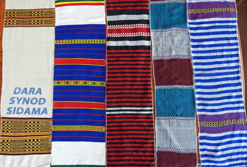 In Ethiopia the Lutheran "Synods" are districts of perhaps hundreds of churches and hundreds of thousands of church members. They have Synod Presidents. We met seven of them at the start of Parish Nursing training in Hawassa. We were introduced to all of them in Addis Ababa in the last days of our stay in Ethiopia. The map on the previous page gives the names and locations of those Synod headquarters that we visited. At some of our meetings with Synod officials we were each draped with a long cloth representing a particular Synod, making us honorary members. These cloths in the following image are less than half of their lengths.