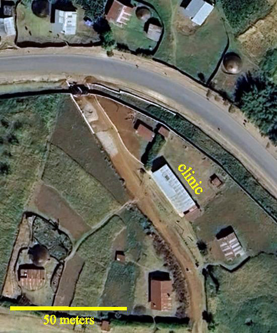 A clinic was started at Hagere Salem, Ethiopia, by Scandinavian missions in 1946. It is now operated by the Hagere Salem Synod (district) of the Ethiopian Evangelical (Lutheran) Church Mekane Yesus. Its geographic location is on a mountain ridge region at N 6 30' 11.52", E 38 30' 05.90", illustrated by this satellite image.