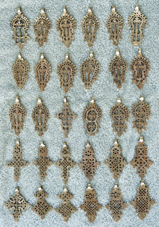 The Ethiopian Orthodox Tewahedo church community has created cross designs, individually hand-crafted from bullet shells from the relatively recent military activity. The crafts persons have turned the metal of war into symbols of peace and reconcilliation. The three cities of Axum, Lalibela, and Gondar usually have unique general styles. The large crosses are carried in processions. The small crosses are worn as amulets and serve as signs of faith.