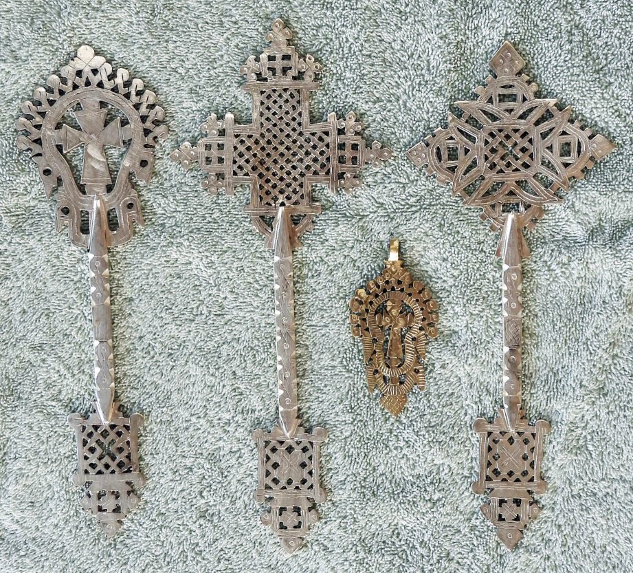 The large cross at the left and the small cross may be from the Lalibela area. I will try to recall the symbolism, some of which may also apply to the other two large crosses. At the very bottom is a small box, representing Adam's tomb. There are 3 points around the tomb, possibly representing the care of the Trinity. Above that is a large box with lace work. The lace represents unending eternity. The box itself has two possible interpretations. It could be the Ark built by Noah that saved 8 people from the global Flood. It could also be the Ark of the Covenant, so precious in Ethiopia, physically representing God's presence here on Earth. The vertical shaft is a connection between the Old Testament and the New Testament. It could also represent Jesus Christ descending to Earth from Heaven to give us the only Way to Heaven.