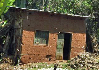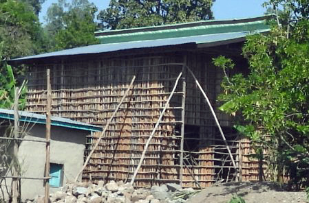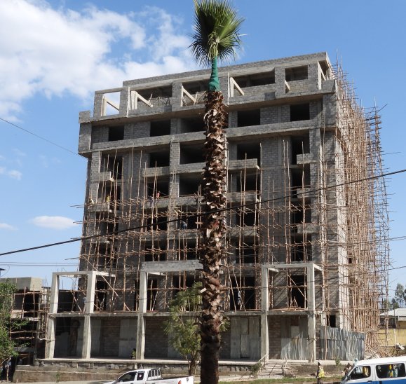 In major villages and urban areas a frame of pillars of reinforced concrete are erected, as in the foreground of the next photo. They can hold concrete floors and roofs. Concrete blocks or ceramic tiles fill in the walls between the pillars. Note in the rear building the same eucalyptus sticks are used for the scaffolding.