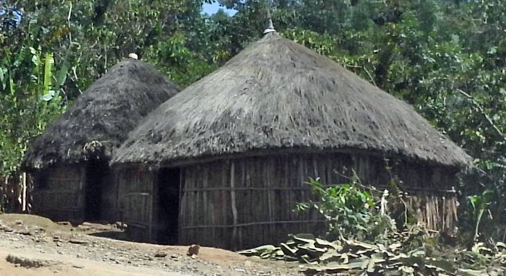 The oldest homes are circular around a vertical central pole, with a thatch roof. Sides may be of straw, sticks, and dried mud.