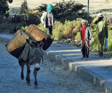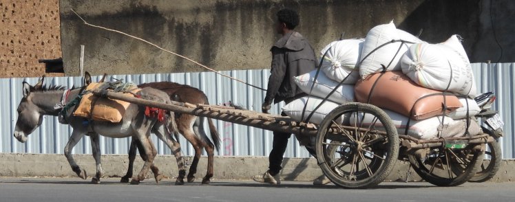 Donkeys are used to carry loads or pull wagons loaded with items.