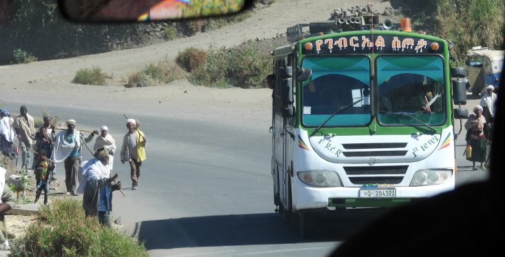 Lalibela pilgrims walking home, being passed by a regional bus.